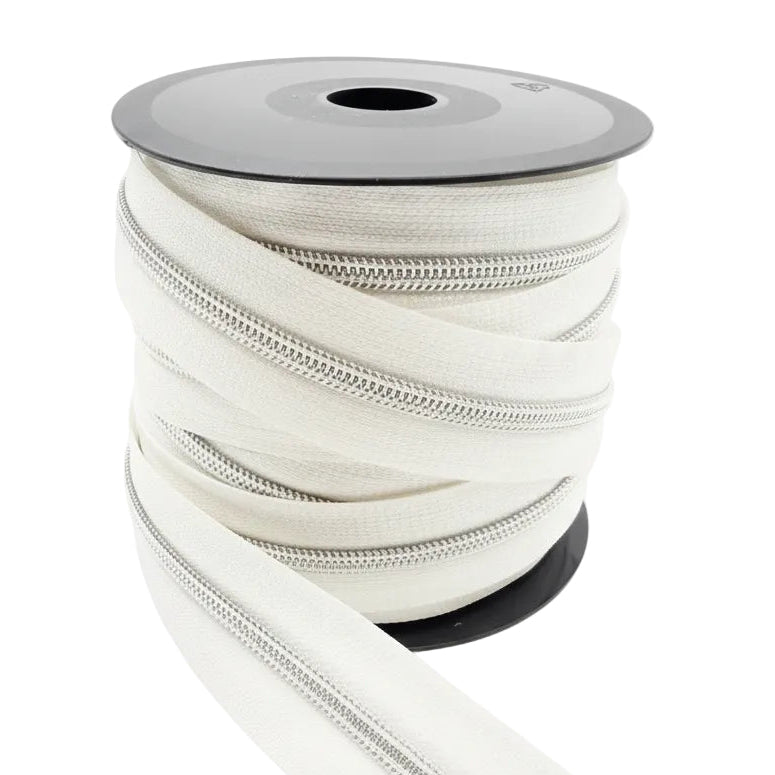 Glidelås metervare 6mm Spiral - Metalllook Sølv/Hvit (Pris oppgitt pr dm)
