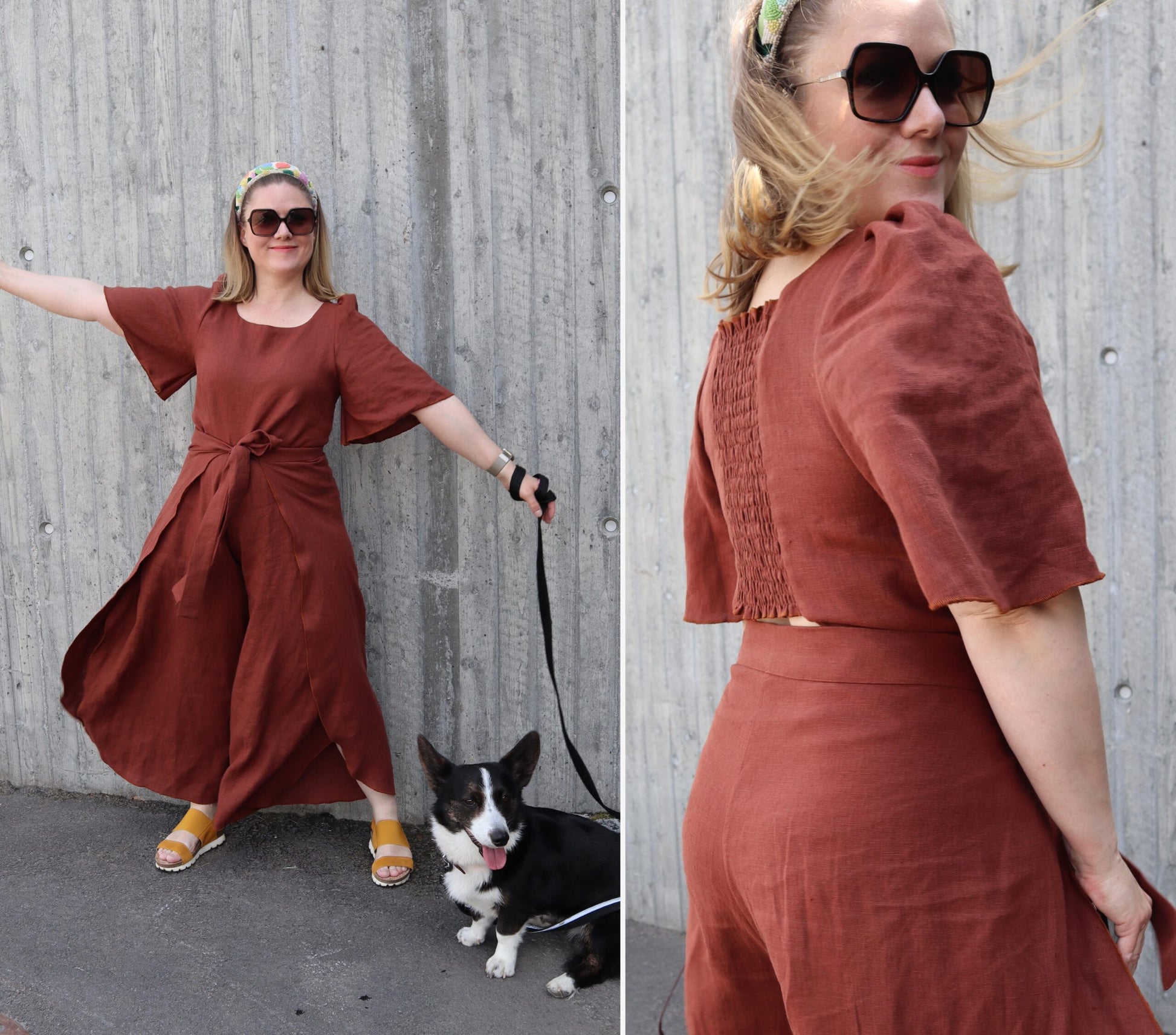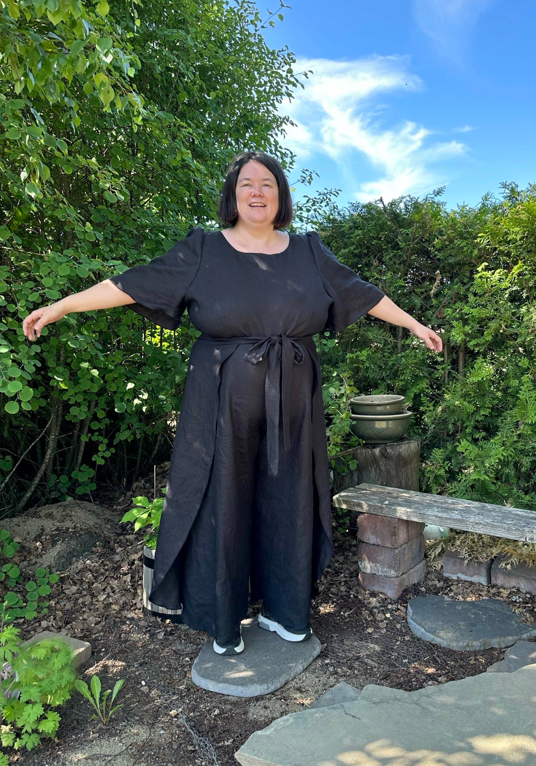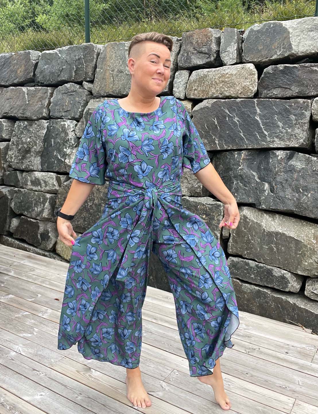 JUNI JUMPSUIT er en luftig og lett jumpsuit, perfekt til varme sommerdager. Jumpsuiten har mange valg for ulike variasjoner av overdelen. På illustrasjonen på forsiden er jumpsuiten sett forfra i kolonnen til høyre, og sett bakfra i kolonnen til venstre. Jumpsuiten kan også sys som shorts. Det er mye ledighet i buksedelen, mens overdelen er mer figurnær – men denne har også en del ledighet. Mønsteret er laget for vevde stoffer, uten stretch. Stoffer med pent fall, som vevd viskose eller lin passer perfekt.